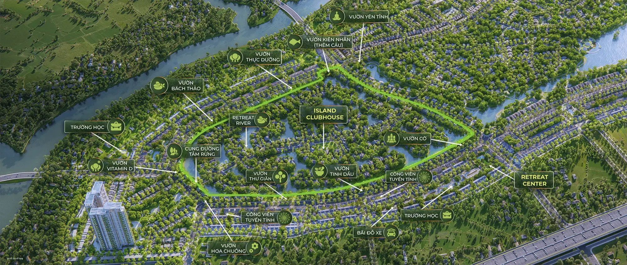 Chuỗi tiện ích Eco Retreat Island vượt qua những chuẩn mực thông thường, tập trung vào các giá trị “Wellness-Smart living” hướng đến cân bằng thân, tâm, trí đích thực. Chủ đầu tư đã tạo nên không gian nghỉ dưỡng đầy cảm hứng, giao hòa thiên nhiên với 8 khu vườn chủ đề được kiến tạo để bao bọc Retreat Island trong vòng tay thiên nhiên thuần khiết. Mỗi khu vườn là một tuyệt tác nghệ thuật, mang trong mình câu chuyện riêng biệt, khơi mở hành trình khám phá vẻ đẹp vô tận của đất trời.
